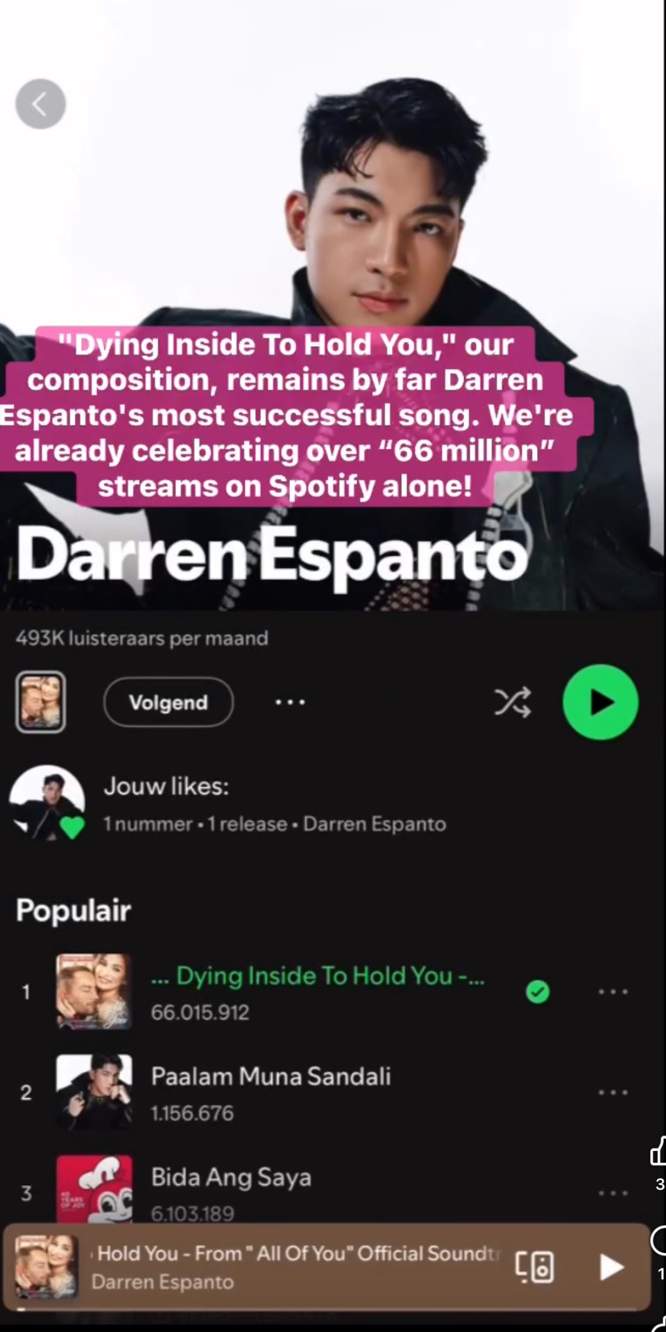 January 20 2025: Canadian/Filipino singer Darren Espanto's version of our song "Dying Inside To Hold You" surpasses 64 MILLION streams on Spotify alone!!
