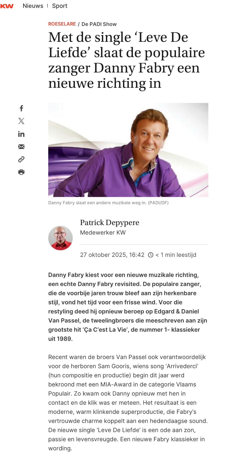 May 2024: VanPasselBrothers' composition "Arrivederci", performed by famous Belgian singer 'Sam Gooris', rose to the top of the Belgian charts immediately upon release. The song is released on "VanPasselBrothers" Record Company and was nominated for "Zomerhit 2024". As a result of that success, Sam Gooris wins the Music Industry Award (MIA) in the "Flemish Popular" category on January 29, 2025 with "Arrivederci".